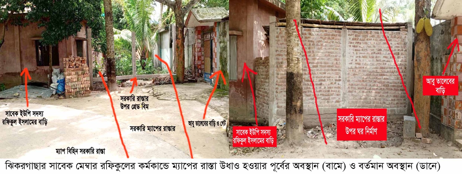আবু তালেব আরও জানান, আর.এস রেকর্ড অনুযায়ী সাবেক ইউপি সদস্যের বসতবাড়ির পশ্চিম ও দক্ষিণ পাশে একটি রাস্তা রয়েছে। তিনি তার নিজের উপকারের জন্য রাতের অন্ধকারে আইনকে বৃদ্ধাঙ্গুলী দেখিয়ে রাস্তাটি বসতবাড়ির ডান সাইট থেকে সরিয়ে বসতবাড়ির পিছন থেকে দিয়ে দিয়েছেন। সাবেক ইউপি সদস্যে বসতবাড়ির ডান সাইটে সরকারি ম্যাপের রাস্তার পাশে আবু তালেবের গেট বিশিষ্ট বসতবাড়ি রয়েছে। সাবেক ইউপি সদস্যে তার বসতবাড়ির ডান পাশের রাস্তাটি সরিয়ে পিছনে দেওয়ার করণে আমার বসতবাড়ির গেট ক্রমাগতই ভেঙ্গে দিতে চাই এই সাবেক ইউপি সদস্য।