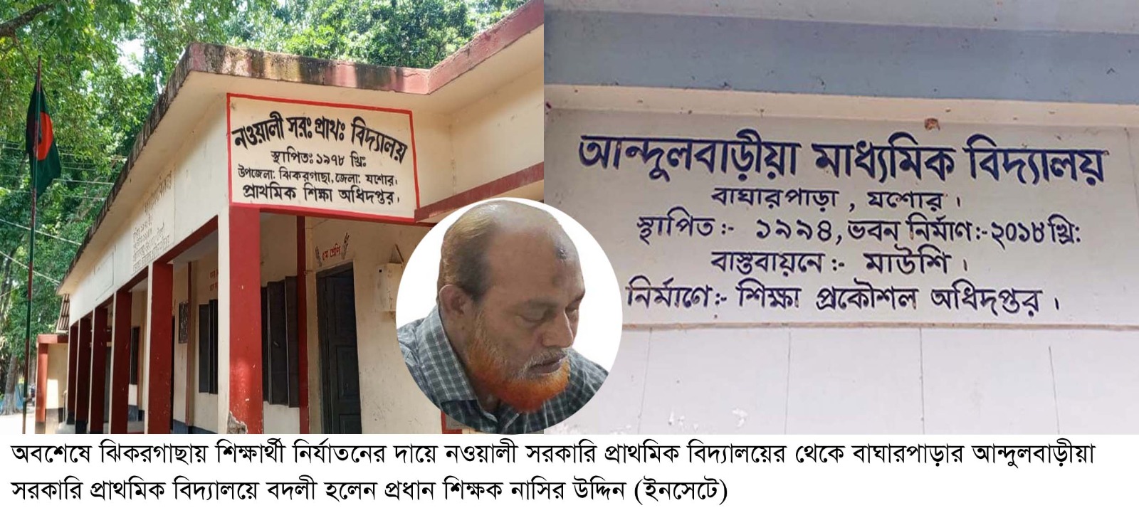 যশোরের ঝিকরগাছা উপজেলার নির্বাসখোলা ইউনিয়নের নওয়ালী গ্রামের মনিরুল ইসলাম ও আমেনা বেগম দম্পতির ১১বছরের কন্যা এবং নওয়ালী সরকারি প্রাথমিক বিদ্যালয়ের পঞ্চম শ্রেণির শিক্ষার্থীকে মারপিট সহ লাথি মারার করণে অবশেষে বিদ্যালয়ের প্রধান শিক্ষক নাসির উদ্দিনকে উক্ত প্রতিষ্ঠান থেকে অন্য প্রতিষ্ঠানে বদলি করা হয়েছে। যেটা জেলা প্রাথমিক শিক্ষা অফিসার মোঃ আশরাফুল আলমের স্বাক্ষরিত অফিস আদেশের মাধ্যমে প্রকাশ পেয়েছে।