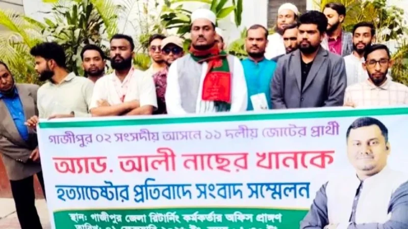 এতে বলা হয়, গত ৩০ জানুয়ারি এরশাদ নগর ৫ নম্বর ব্লক ছোট বাজারে যুবদলের আনোয়ার ও সন্ত্রাসী কামুর লোকজন শাপলা কলির প্রচারণায় বাধা দেন। পোড়াবাড়ি বাজারে স্থাপিত অ্যাডভোকেট আলী নাছের খানের নির্বাচনী বিলবোর্ড ছিঁড়ে ফেলে। এ ধরনের ঘটনা দেশের অন্যান্য স্থানের মতো সন্ত্রাসী আক্রমণের ইঙ্গিত বহন করে যা সুষ্ঠু নির্বাচনী পরিবেশের অন্তরায়। এমতাবস্থায় ১১ দলীয় জোটের নেতাকর্মীরা চরম নিরাপত্তাহীনতা বোধ করছেন বলে অভিযোগ করেন। সন্ত্রাসী আক্রমণের চেষ্টা, প্রচারে বাধা প্রদান ও বিলবোর্ড ছিঁড়ে ফেলার ঘটনায় নির্বাচন কমিশন, রিটার্নিং কর্মকর্তা ও গাজীপুর মেট্রোপলিটন পুলিশকে যথাযথ আইনানুগ ব্যবস্থা গ্রহণের আহ্বান জানান।