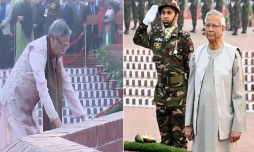 প্রধান উপদেষ্টা বলেন, একটি শান্তিপ্রিয় জাতি হিসেবে আমরা সকল বন্ধু রাষ্ট্রের সঙ্গে সম্মানজনক সহাবস্থানে বিশ্বাসী। তথাপি যেকোনো আগ্রাসী বহিঃশত্রুর আক্রমণ থেকে দেশের সার্বভৌমত্ব রক্ষার জন্য আমাদের সদা প্রস্তুত ও সংকল্পবদ্ধ থাকতে হবে। এ লক্ষ্যে সেনা, নৌ ও বিমানবাহিনীর আধুনিকায়ন, উন্নত প্রশিক্ষণ এবং উন্নত বিশ্বের সঙ্গে তাল মিলিয়ে বাহিনীগুলোতে যুগোপযোগী প্রযুক্তি সংযোজনের প্রয়াস অব্যাহত রয়েছে।