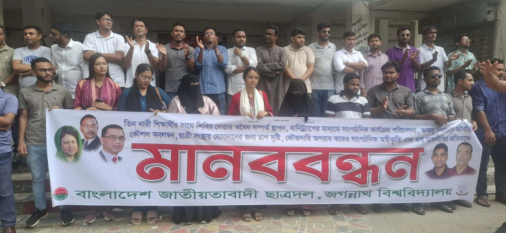 জগন্নাথ বিশ্ববিদ্যালয়ে (জবি) এক শিক্ষার্থীকে ঘিরে একাধিক নারী শিক্ষার্থীর সঙ্গে অনৈতিক সম্পর্ক, প্রতারণা ও হয়রানির অভিযোগের প্রতিবাদে মানববন্ধন করেছে বিশ্ববিদ্যালয় শাখা ছাত্রদল। মঙ্গলবার (২১ এপ্রিল) ভাষা শহীদ রফিক ভবনের সামনে এ কর্মসূচি অনুষ্ঠিত হয়।