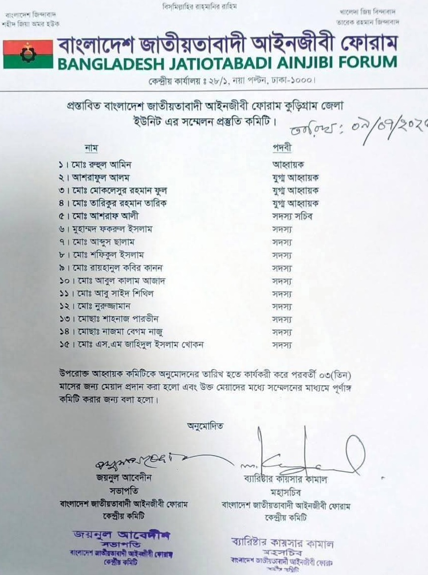 জাতীয়তাবাদী আইনজীবী ফোরামের কুড়িগ্রাম জেলার আহ্বায়ক কমিটি গঠন