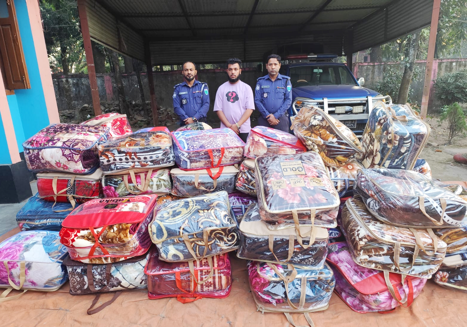 পুলিশ সূত্রে জানা যায়, গোপন সংবাদের ভিত্তিতে শনিবার (১৩ ডিসেম্বর) বিকেল ৪টার দিকে সিলেট-তামাবিল মহাসড়কের জৈন্তাপুর থানার সামনে চেকপোস্ট স্থাপন করে তল্লাশি চালানো হয়। এ সময় ঢাকা থেকে ছেড়ে আসা পর্যটকবাহী হানিফ পরিবহনের একটি বাস (ঢাকা-মেট্রো-ব-১৫-১৯৭৭) তল্লাশি করে এসব কম্বল উদ্ধার করা হয় এবং একজনকে আটক করা হয়।