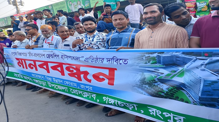 তিস্তা নদীর তীরবর্তী চরাঞ্চলে আন্তর্জাতিক মানের এক হাজার শয্যার হাসপাতাল নির্মাণের দাবিতে রংপুরের গঙ্গাচড়ায় মানববন্ধন অনুষ্ঠিত হয়েছে।