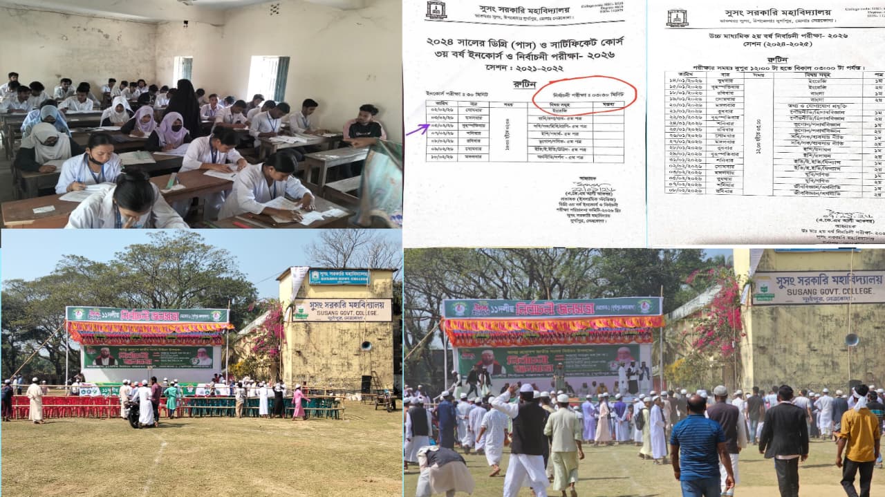 নেত্রকোনার দুর্গাপুরে সুসং সরকারি কলেজ-এ ২য় বর্ষের সমাপনী (টেস্ট) পরীক্ষা চলাকালীন রাজনৈতিক সমাবেশের আয়োজন করায় চরম ভোগান্তিতে পড়েছেন পরীক্ষার্থীরা।