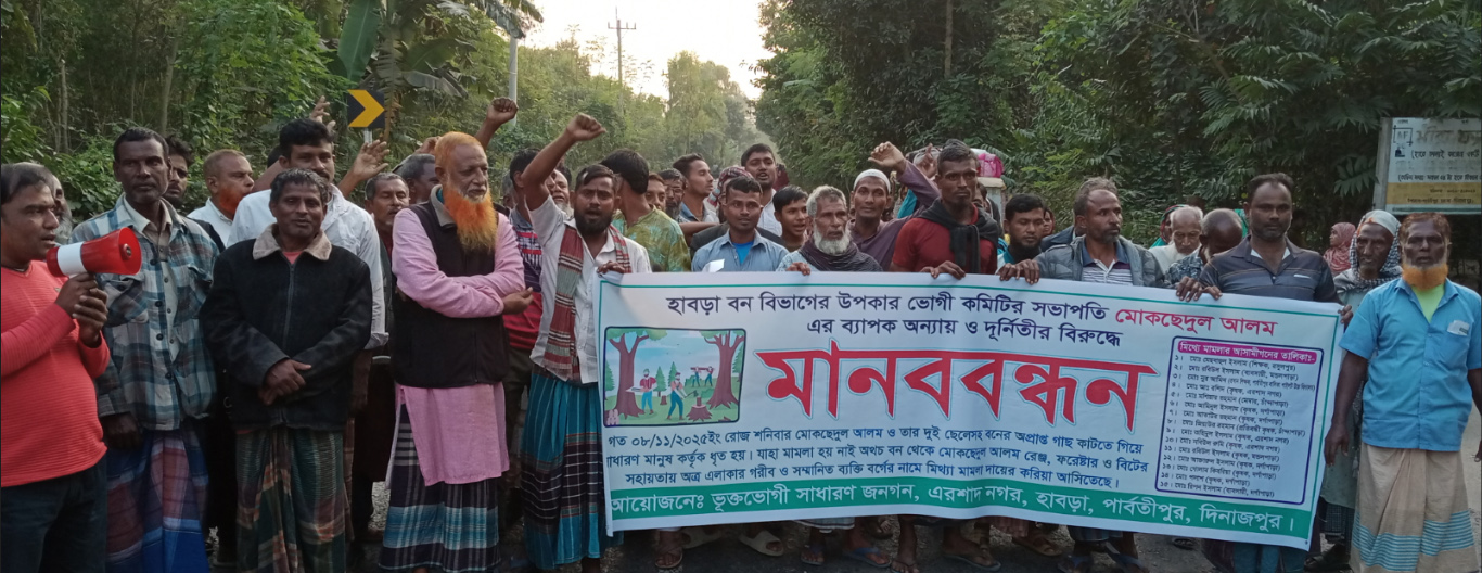 দিনাজপুর পার্বতীপুরে হাবড়া বনবিভাগের উপকারভোগি কমিটির সভাপতি মোকছেদুল আলম এর ব্যাপক অন্যায় ও দূর্নীতির বিরুদ্ধে মানববন্ধন করেছে হাবড়া এরশাদ নগর এলাকার ভুক্তভোগীরা।