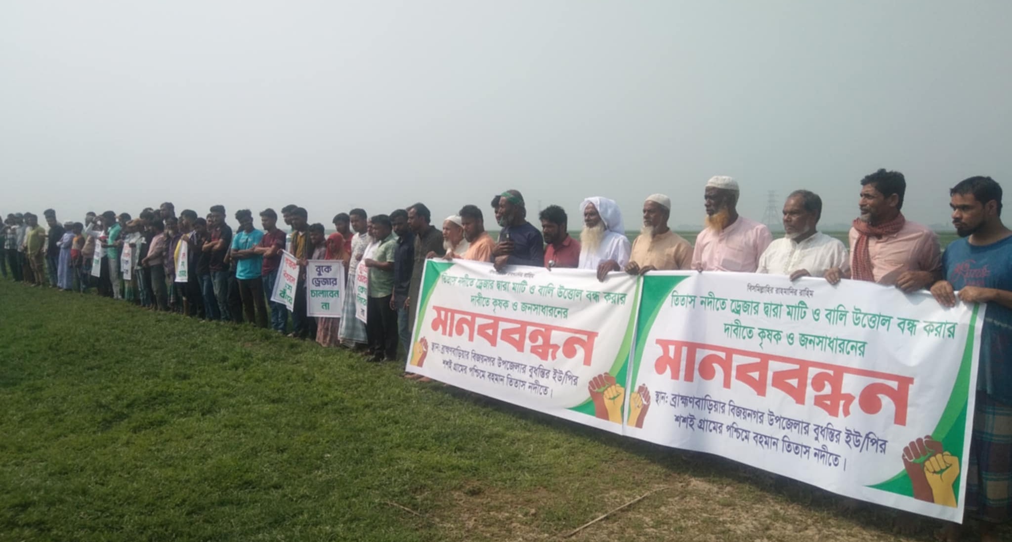 ব্রাহ্মণবাড়িয়ার বিজয়নগর উপজেলার শশই গ্রামে তিতাস নদী থেকে বালু উত্তোলনের প্রতিবাদে মানববন্ধন করেছে এলাকাবাসী।