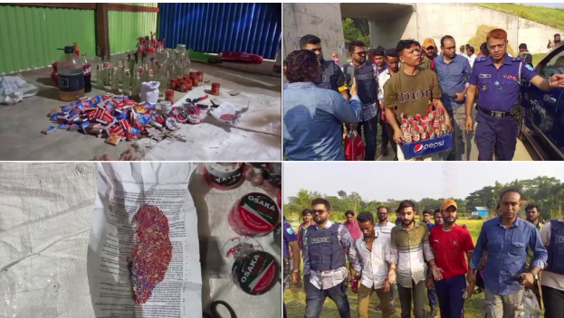 স্থানীয় সূত্রে জানা গেছে, পরিত্যক্ত টিনের ঘরে তারা কয়েকদিন ধরে অবস্থান করছিলেন। বুধবার দুপুরে পুলিশ অভিযান চালিয়ে ২৩টি পেট্রোলবোমা, গানপাউডার, পেট্রোল, অকটেন ও বিস্ফোরক তৈরির বিভিন্ন সরঞ্জাম উদ্ধার করে।