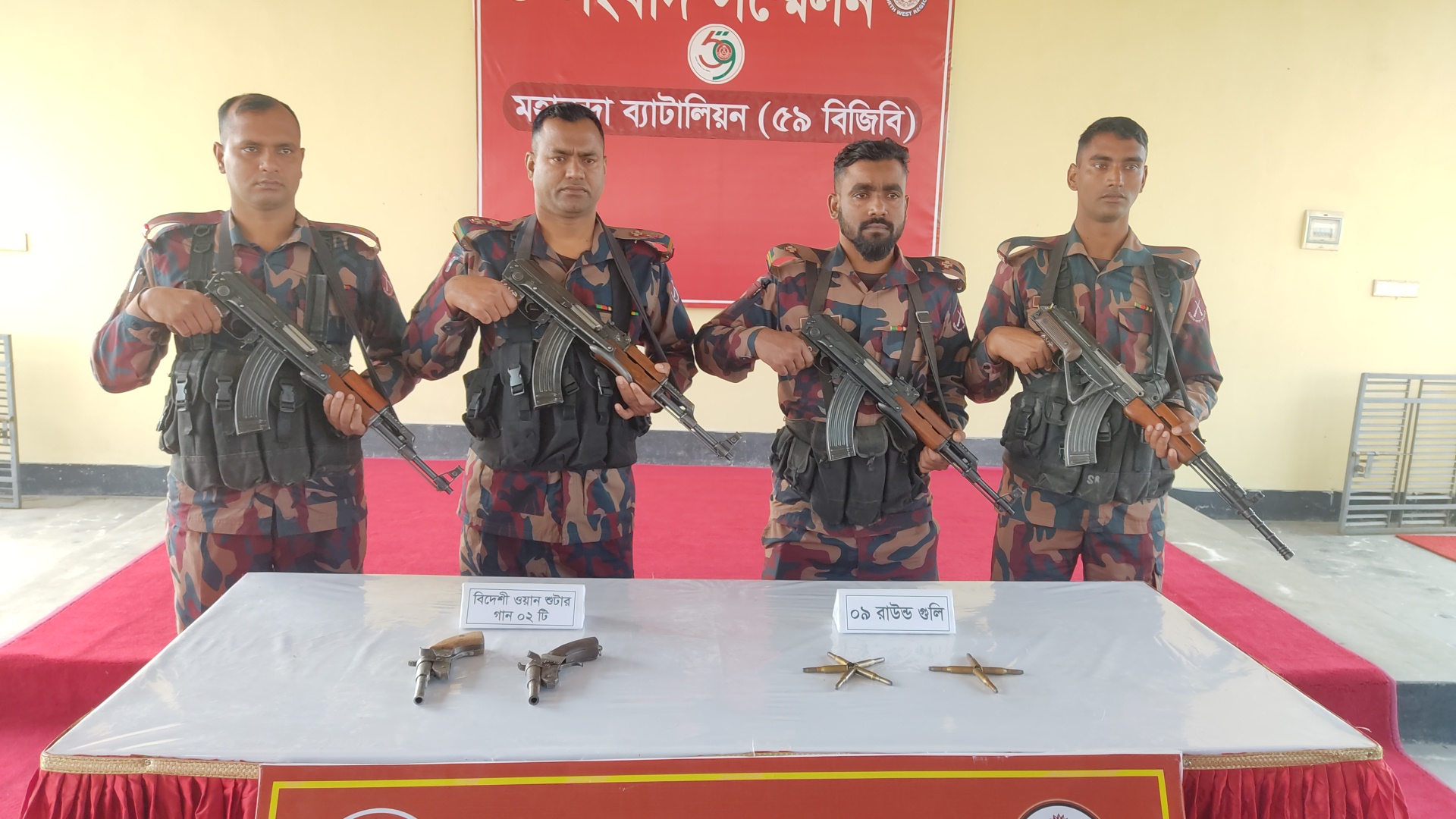 চাঁপাইনবাবগঞ্জের শিবগঞ্জ উপজেলার আজমতপুর সীমান্ত এলাকার একটি আমবাগান থেকে দুটি বিদেশি ওয়ান শুটার গান ও নয় রাউন্ড গুলি উদ্ধার করেছে বর্ডার গার্ড বাংলাদেশ (৫৯বিজিবি)। বৃহস্পতিবার, ৮ ডিসেম্বর রাত আনুমানিক ৯টার দিকে উপজেলার শাহবাজপুর ইউনিয়নের উনিশবিঘা গ্রামের সীমান্ত পিলার ১৮২/৩-এস থেকে প্রায় ৪০০ গজ বাংলাদেশের অভ্যন্তরে অবস্থিত একটি আমবাগানে বিশেষ অভিযান চালিয়ে এসব আগ্নেয়াস্ত্র ও গোলাবারুদ উদ্ধার করা হয়।
