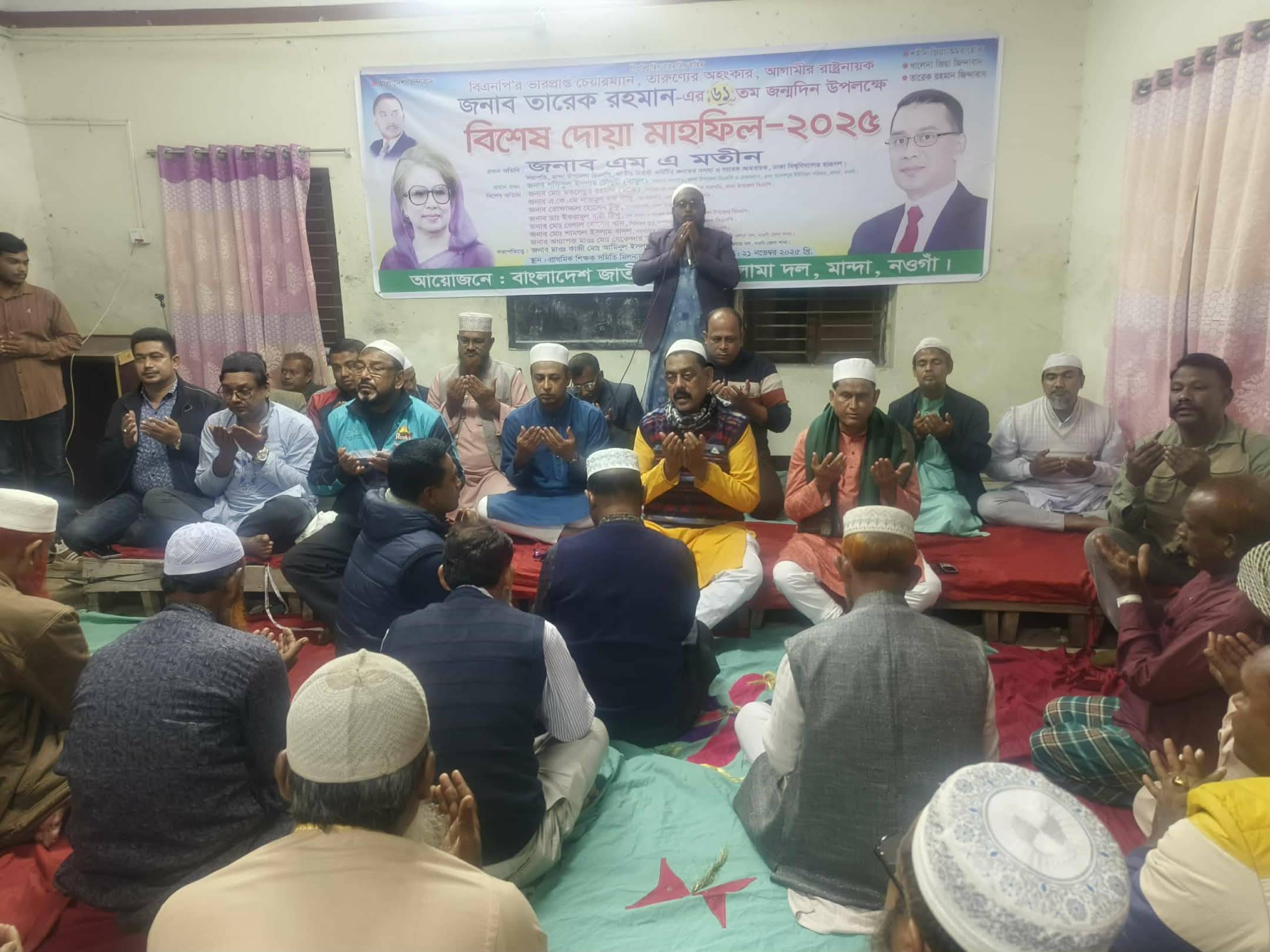 নওগাঁর মান্দায় বিএনপির ভারপ্রাপ্ত চেয়ারম্যান তারেক রহমানের ৬১ তম জন্মদিন উপলক্ষে বিশেষ দোয়া মাহফিল অনুষ্ঠিত হয়েছে। শুক্রবার (২১ নভেম্বর) বিকেলে উপজেলার প্রসাদপুর বাজারে প্রাথমিক শিক্ষক সমিতি মিলনায়তনে বাংলাদেশ জাতীয়তাবাদী ওলামা দলের আয়োজনে এ দোয়া মাহফিল অনুষ্ঠিত হয়। এসময় উপজেলা বিএনপির সাংগঠনিক সম্পাদক শামশুল ইসলাম বাদলের সঞ্চালনায় ও বাংলাদেশ জাতীয়তাবাদী ওলামা দলের সদস্য সচিব কাজী আমিনুল ইসলামের সভাপতিত্বে প্রধান অতিথি হিসেবে বক্তব্য রাখেন, কেন্দ্রীয় বিএনপির নির্বাহী কমিটির সদস্য, মান্দা উপজেলা বিএনপির সভাপতি ও ঢাকা বিশ্ববিদ্যালয় ছাত্রদলের সাবেক আহ্বায়ক এম এ মতীন।