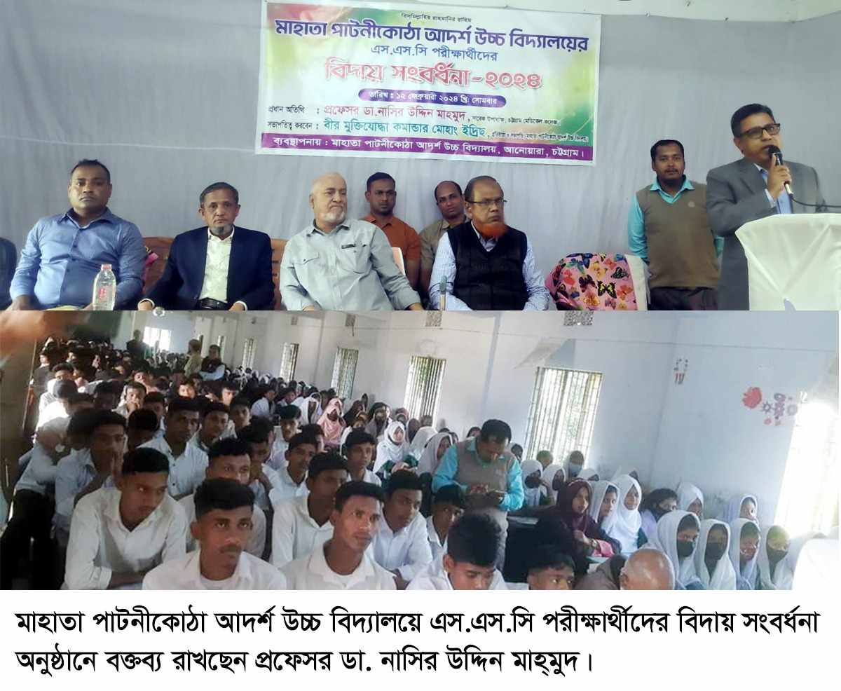 একটি সভ্য সুন্দর বিজ্ঞানভিত্তিক বৈষম্যহীন সমাজ ও রাষ্ট্র প্রতিষ্ঠার ক্ষেত্রে জ্ঞানের কোন বিকল্প নেই। আজকে যারা শিক্ষার্থী আগামী দিনে তাঁরা দেশ ও সমাজ গড়ার কারিগর। শিক্ষা জীবনের একটি গুরুত্বপূর্ণ অধ্যায় এস.এস.সি পরীক্ষা। ভালো লেখাপড়ার পাঠ গ্রহণ করে প্রতিযোগিতামূলক পরীক্ষায় নিজেকে উত্তীর্ণ করে বৃহত্তর জ্ঞান অন্বেষণের জন্য ছাত্রছাত্রীদের ছড়িয়ে পড়ার আহ্বান জানিয়েছেন চট্টগ্রাম মেডিকেল কলেজের সাবেক উপাধ্যক্ষ প্রফেসর ডা. নাসির উদ্দিন মাহ্মুদ। গত ১৩ ফেব্রুয়ারি ২০২৪ মঙ্গলবার আনোয়ারা উপজেলার মাহাতা পাটনীকোঠা আদর্শ উচ্চ বিদ্যালয়ের এস.এস.সি শিক্ষার্থীদের বিদায় সংবর্ধনা অনুষ্ঠানে প্রধান অতিথির বক্তব্যে তিনি উপরোক্ত বক্তব্য রাখেন। তিনি আরও বলেন, জীবনে সফল হতে হলে শিক্ষার কোন বিকল্প নেই।