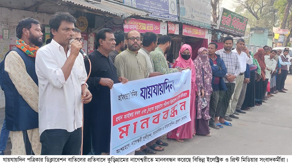 বহুল প্রচারিত বাংলা জনপ্রিয় জাতীয় দৈনিক যায়যায়দিন পত্রিকার ডিক্লারেশন বাতিলের প্রতিবাদে কুড়িগ্রামের নাগেশ্বরীতে মানববন্ধন করেছে উপজেলায় কর্মরত বিভিন্ন জাতীয়, আঞ্চলিক, স্থানীয় পত্রিকা, অনলাইন ও ইলেক্ট্রিক মিডিয়ার সংবাদকর্মীরা।