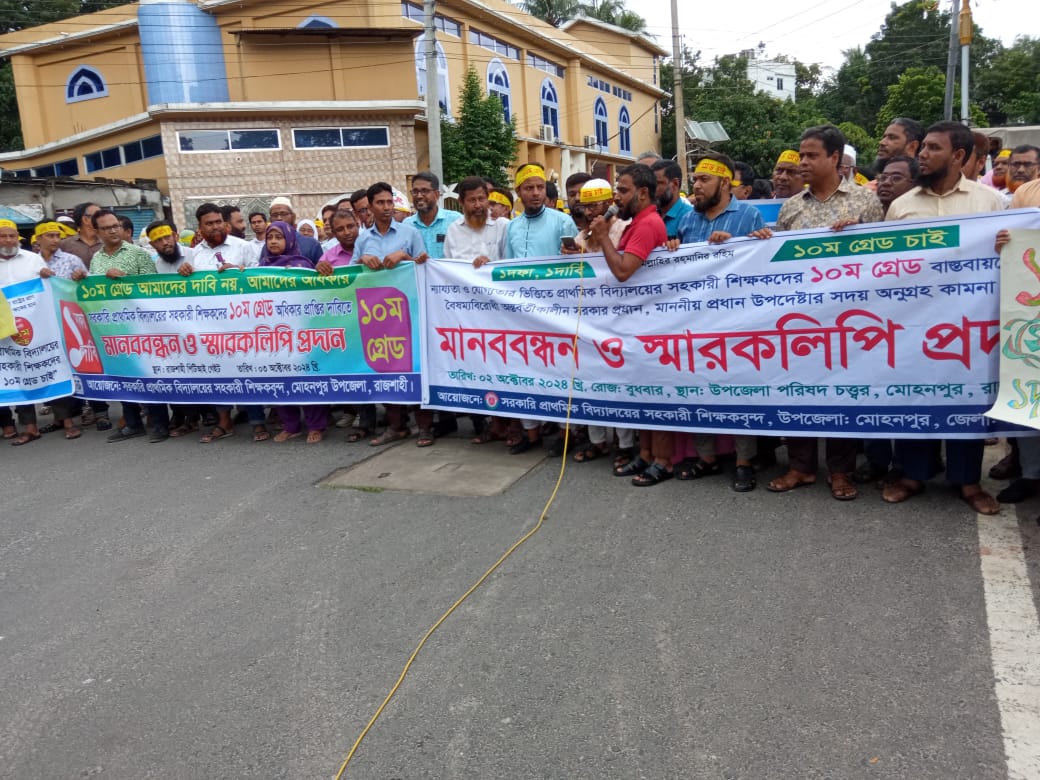 রাজশাহী জেলার সমগ্র প্রাথমিক বিদ্যালয়ের সহকারী শিক্ষকদের ১০ম গ্রেড বাস্তবায়নের দাবিতে রাজশাহী ভেরিপাড়ায় পিটিআই স্কুলের সামনে মানববন্ধন ও জেলা প্রশাসক বরাবর স্মারকলিপি প্রদান কর্মসূচি পালিত হয়েছে।