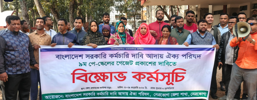 ৯ম পে স্কেলের গেজেট দ্রুত প্রকাশের দাবিতে নেত্রকোনায় বিক্ষোভ কর্মসূচি পালন করেছেন বাংলাদেশ সরকারি কর্মচারী দাবি আদায় ঐক্য পরিষদ। বৃহস্পতিবার (২৯ জানুয়ারি) সকাল ১১টায় জেলা প্রশাসকের কার্যালয় চত্বরে এ কর্মসূচি অনুষ্ঠিত হয়।