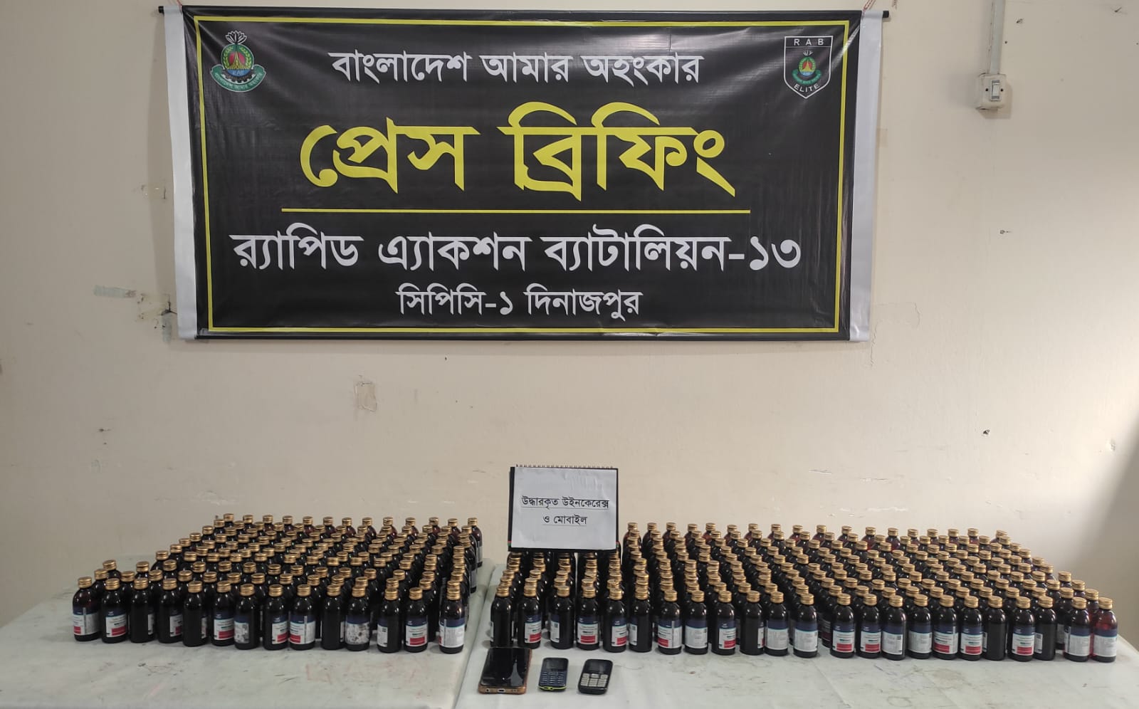 এদিকে পৃথক আরেকটি অভিযানে ২৩ ডিসেম্বর দুপুর ১২টা ৫০ মিনিটে র্যাব-১৩ দিনাজপুর জেলার কোতয়ালী থানাধীন দক্ষিণ দাইনুর সাকিন এলাকায় অভিযান চালায়। অভিযানে গ্রেফতারকৃতদের বসতঘরে তল্লাশি চালিয়ে ঘরের পশ্চিম পাশে খাটের নিচে রাখা প্লাস্টিকের চারটি বস্তা থেকে ৩৬৪ বোতল উইনকেরেক্স সিরাপ জব্দ করা হয়।